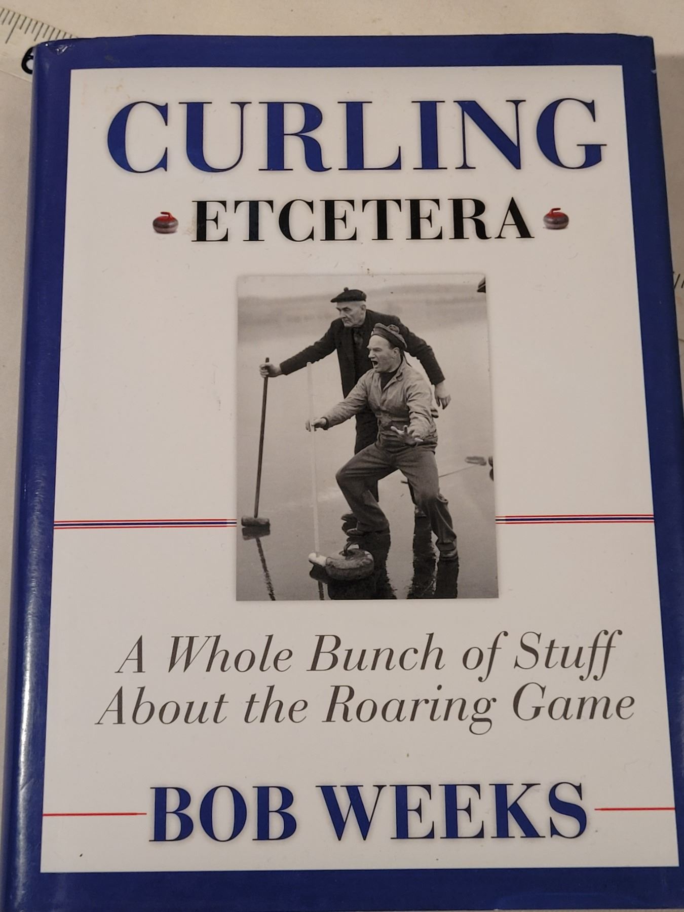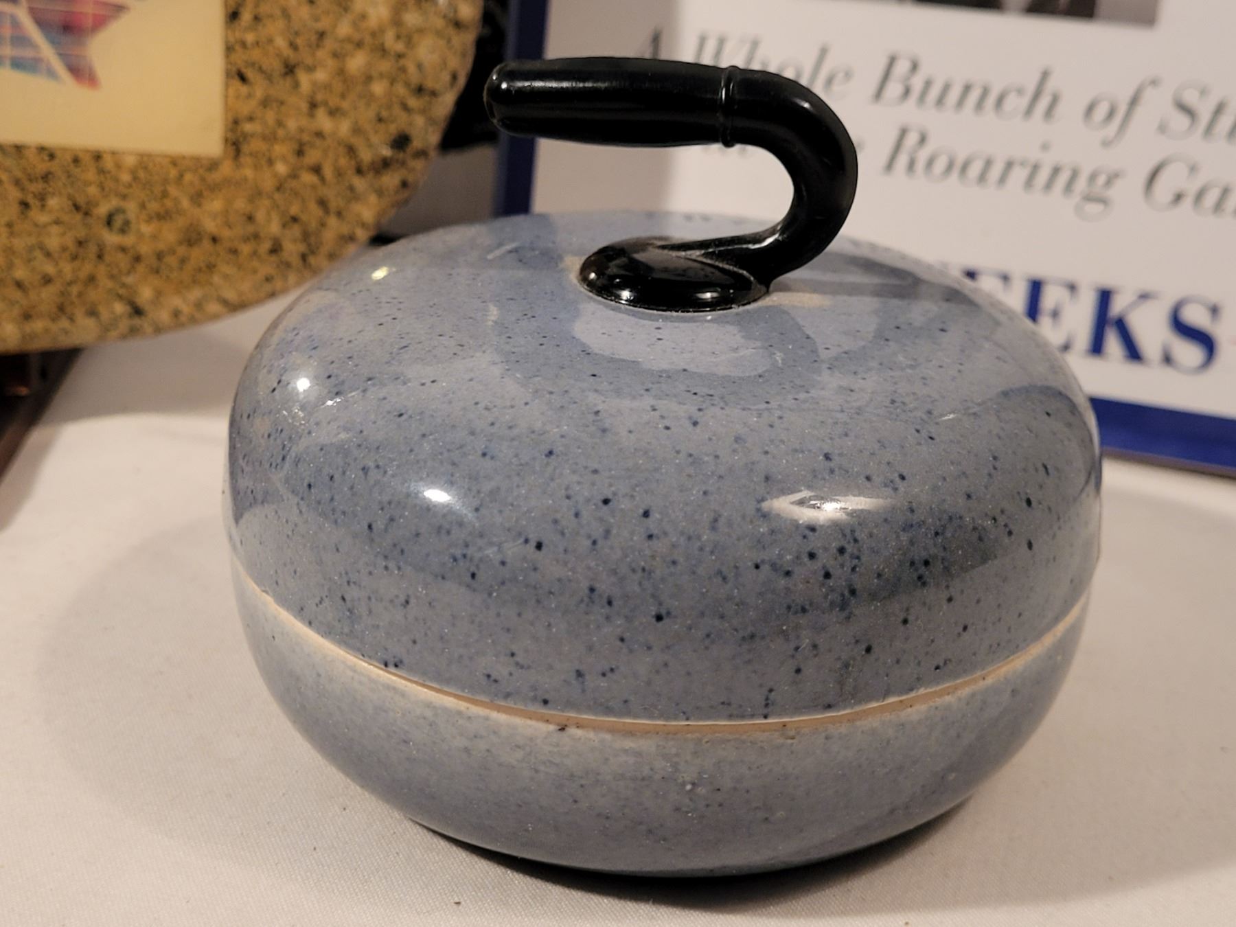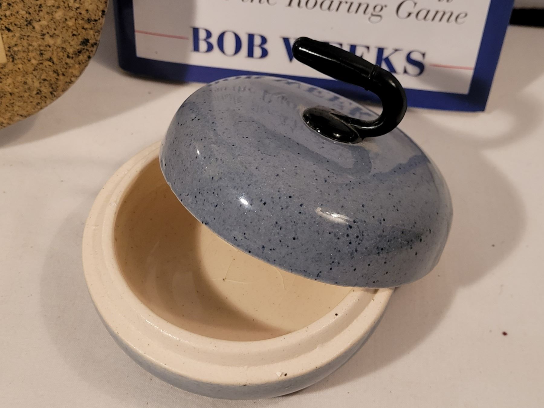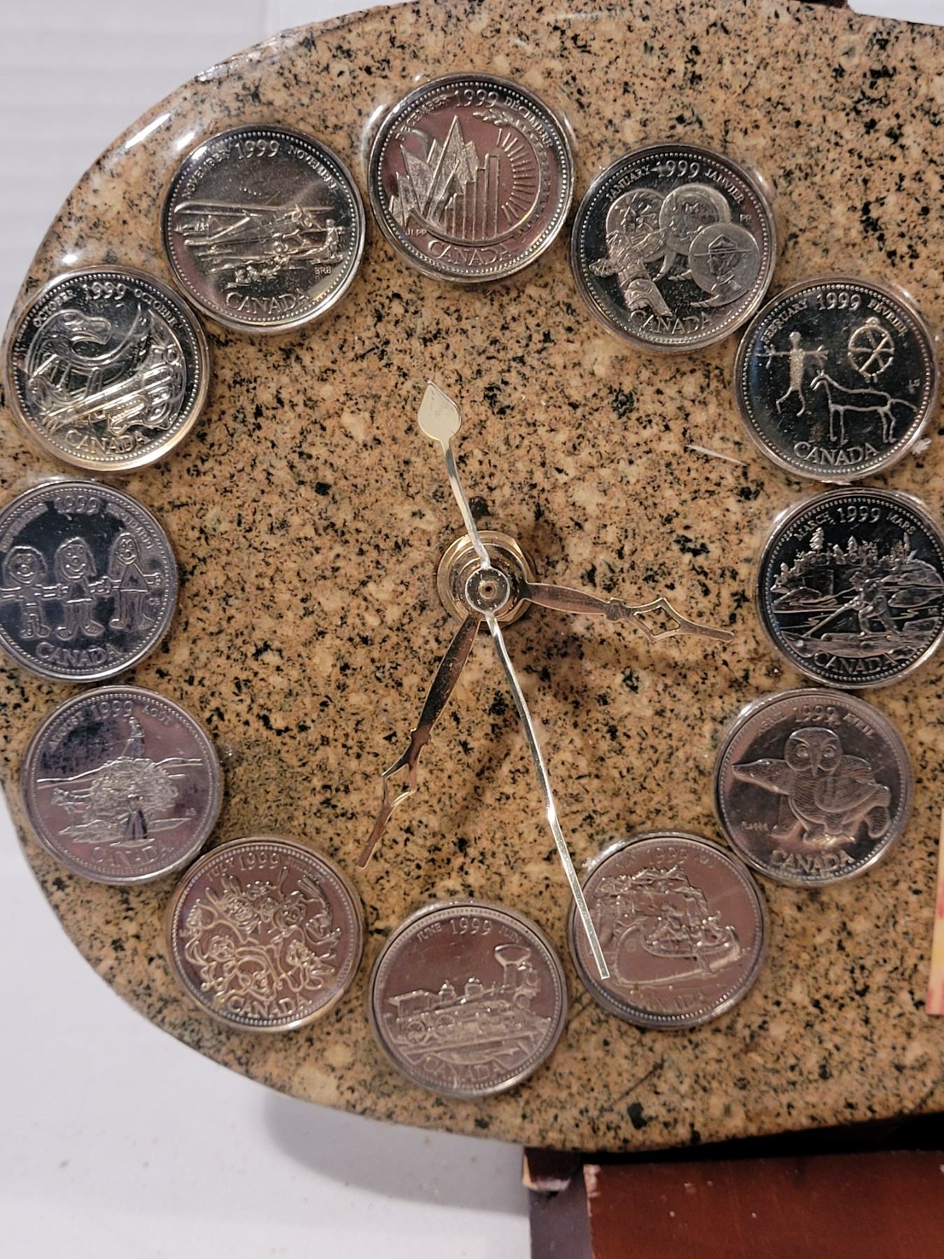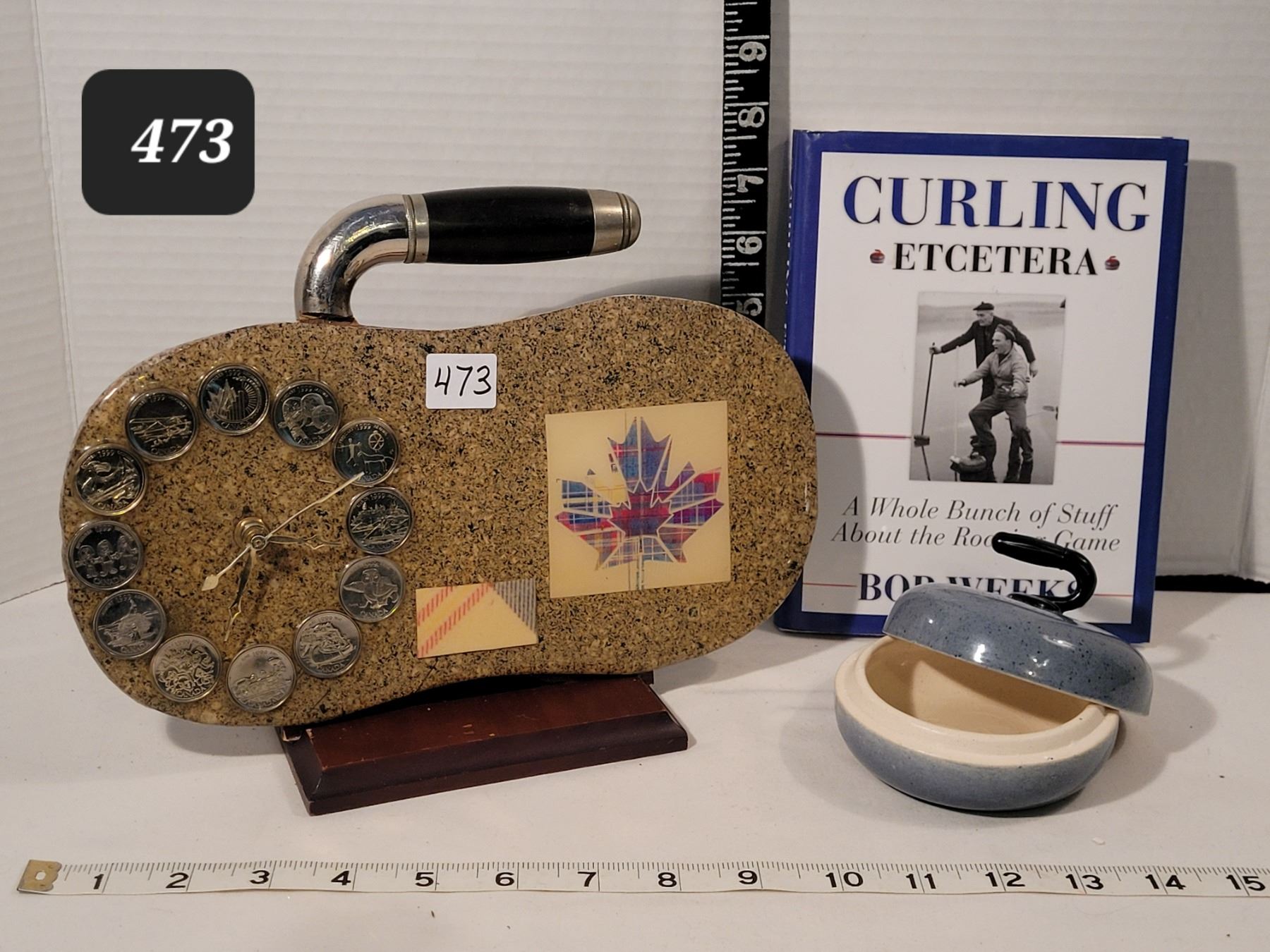 Granite curling rock clock with 1999 special monthly quarters. Curling book & curling rock for trinkets.