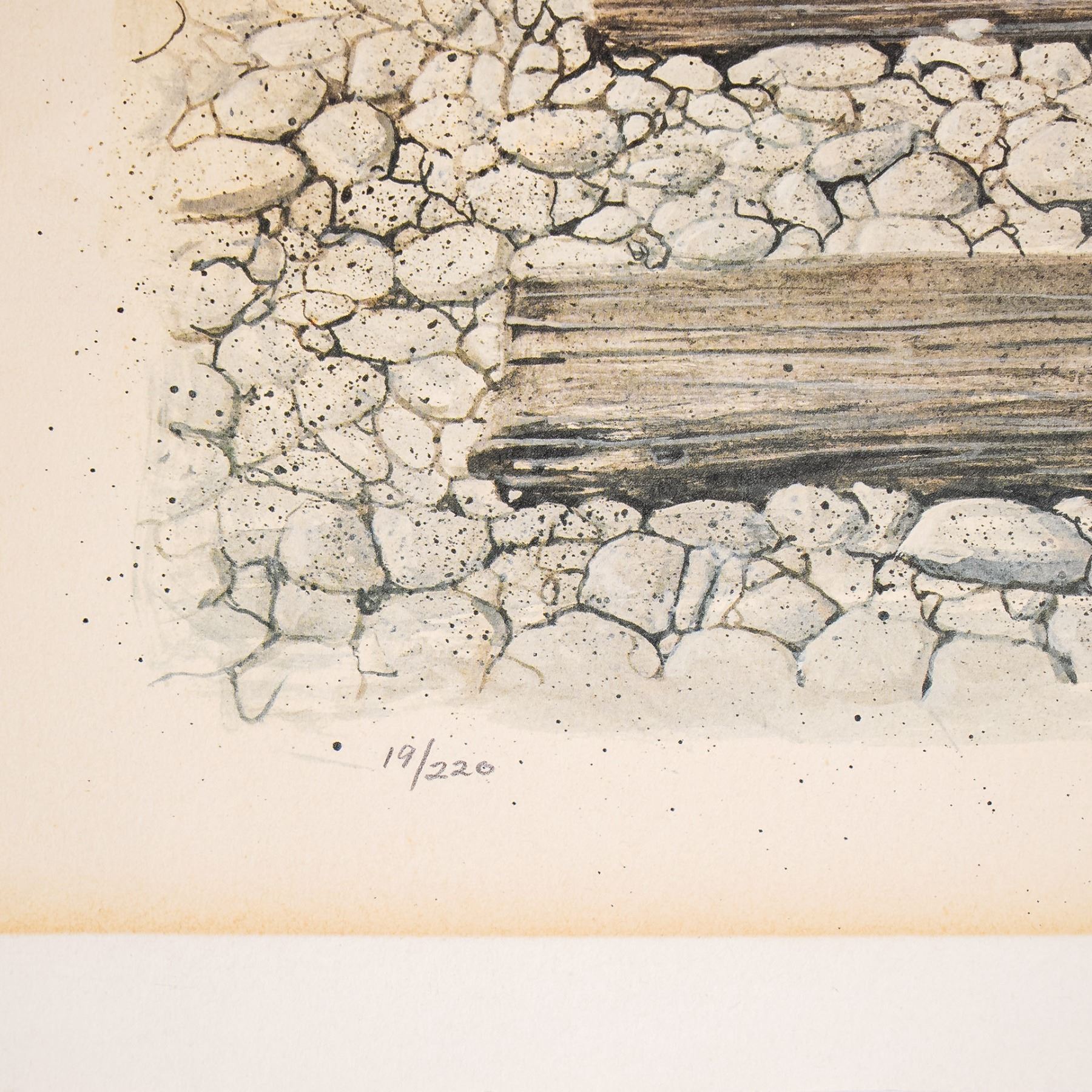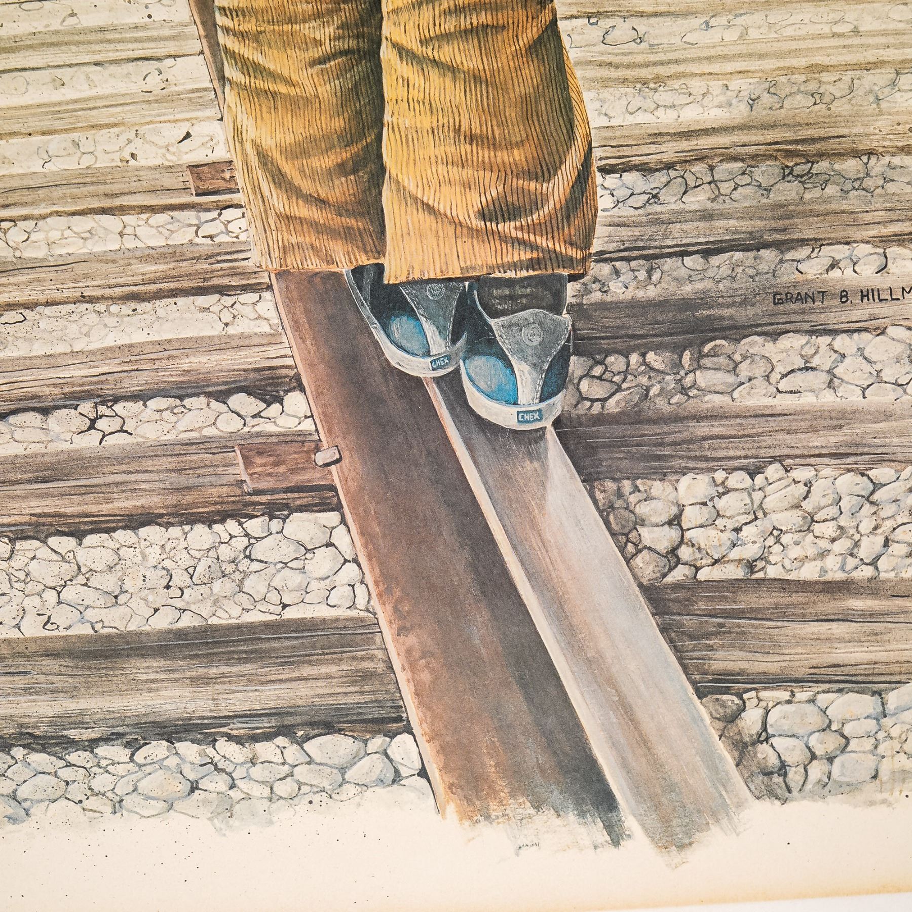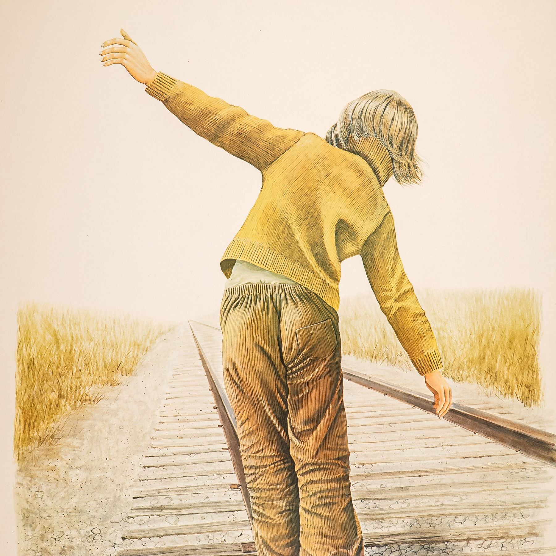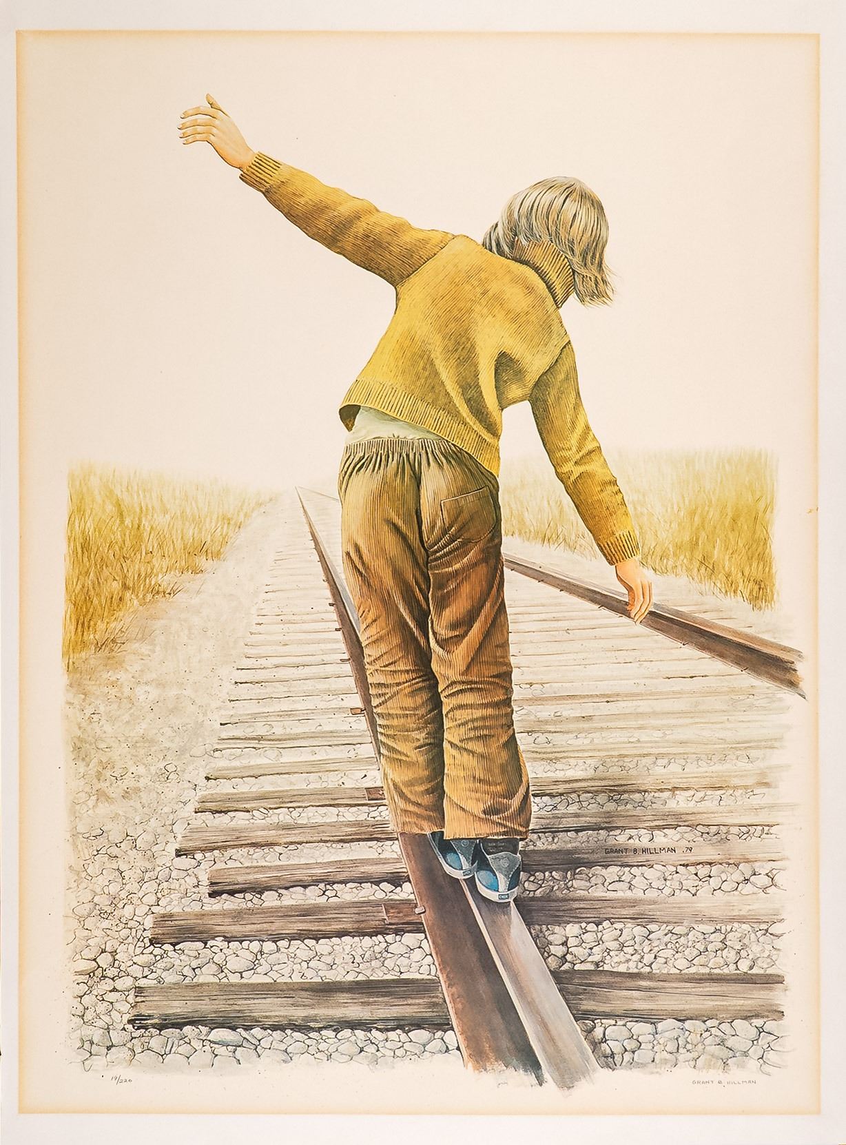 This captivating lithograph by Canadian artist Grant B. Hillman captures the innocence and freedom of youth, depicting a child balancing on railroad tracks with arms stretched wide. Rendered with meticulous detail, Hillman's work conveys both nostalgia and a delicate sense of balance between adventure and vulnerability. Hillman's lithographs are celebrated for their evocative realism and emotional resonance, making this edition a standout addition for collectors of fine American prints. The piece is hand-signed in the lower right by the artist and numbered 19/220.