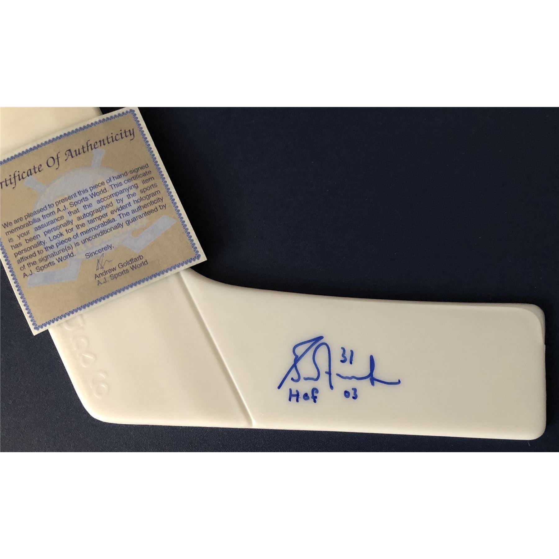 with COA. Inscribed 'HOF 03'. Mini goalie stick. Hockey, NHL, hall of fame, autograph