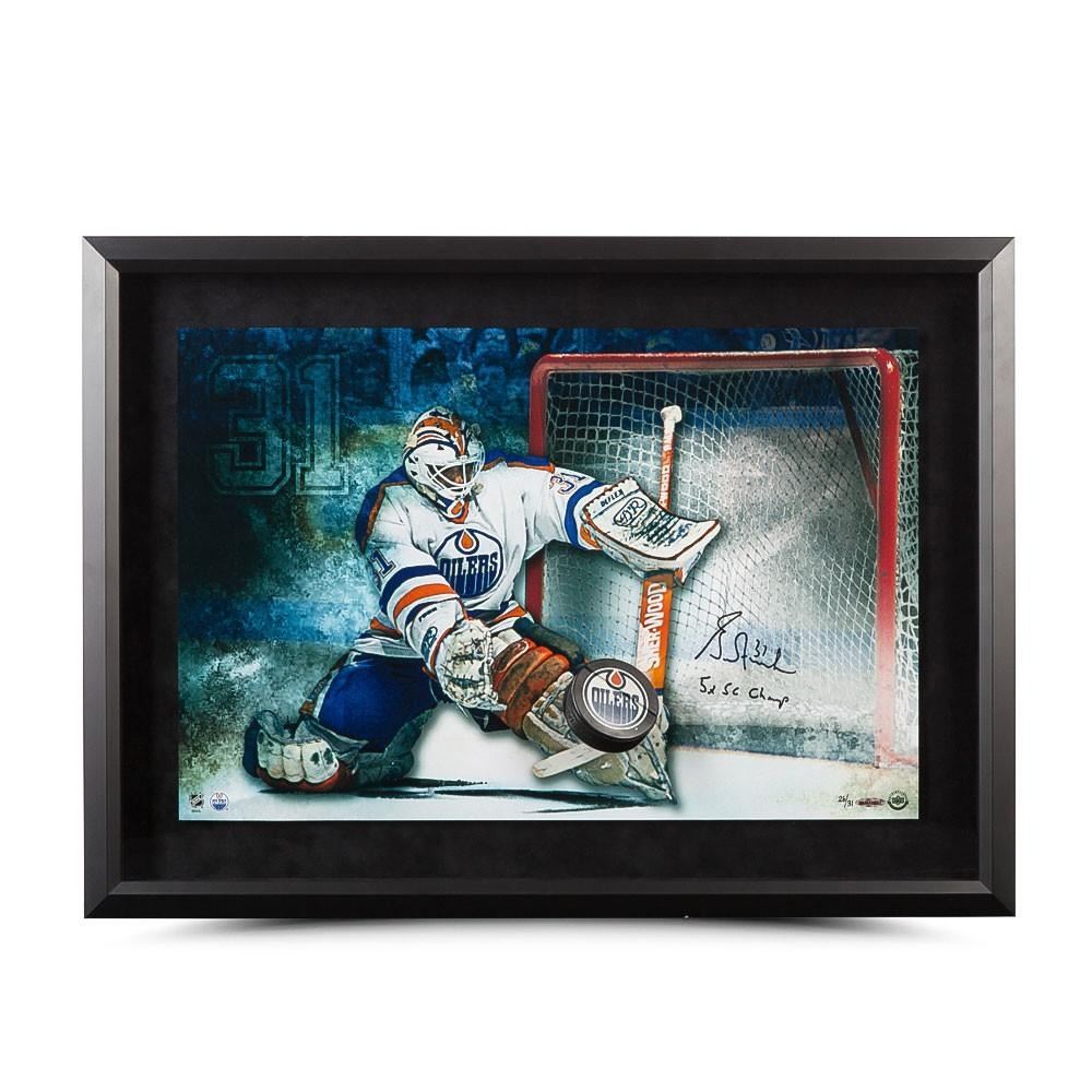 Custom framed display measures 16" x 24" in size and features an Oilers logo hockey puck. Display has been hand-signed and inscribed in black felt-tip pen by Grant Fuhr (HOF).