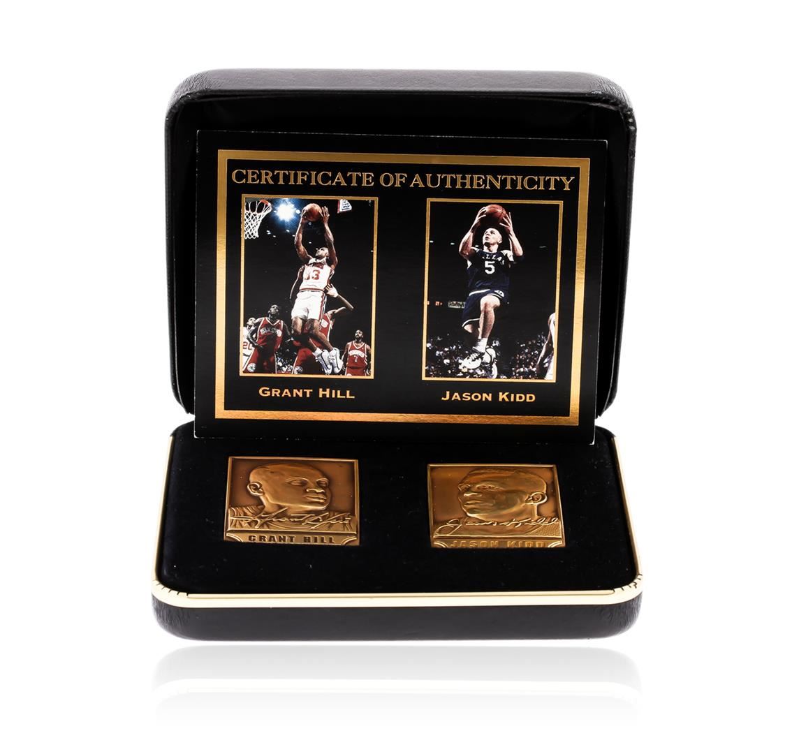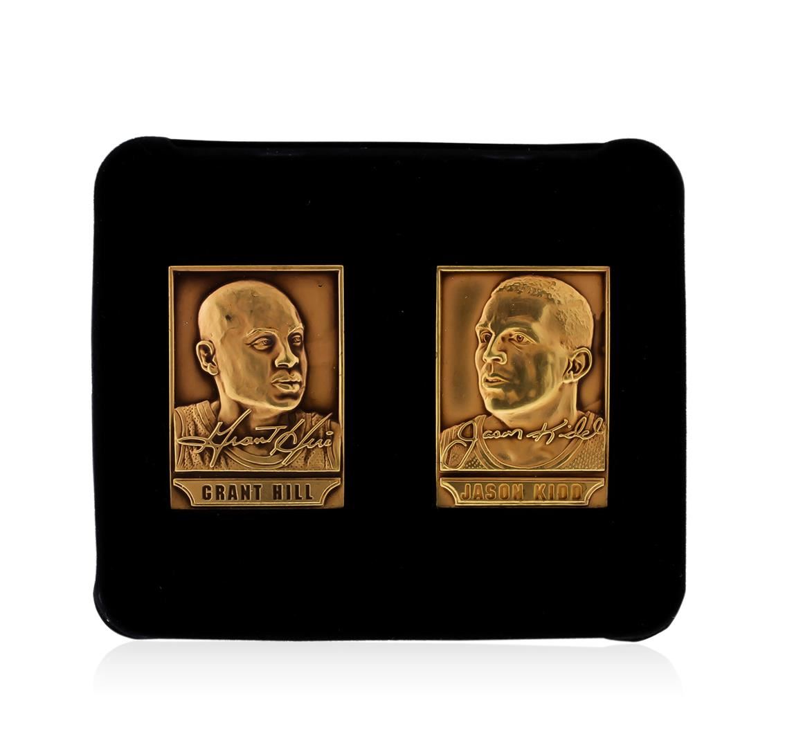 One limited edition mini mint card set of Grant Hill and Jason Kidd numbered #677/5000 minted by The Highland Mint. This NMT condition mini set is made of 3oz pure bronze. Each bronze ingot card is numbered on the back and has the description of players highlights and rookie season to flashback these incredible times. Includes case and Certificate of Authenticity.