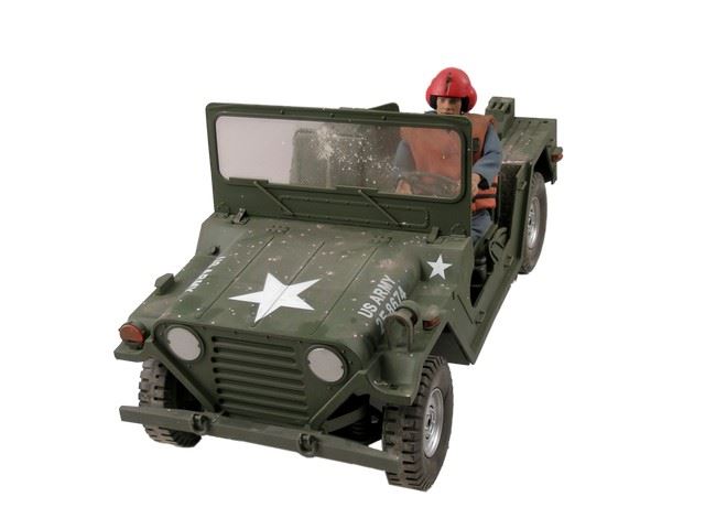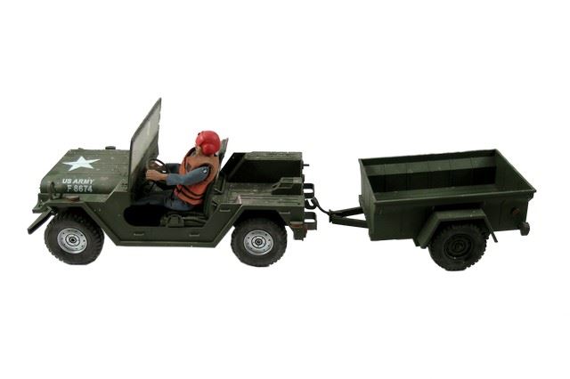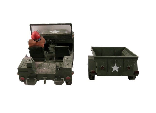 Handmade green plastic US Army model truck and trailer made for an unidentified TV show or Film from the creative team of Grant McCune Studios. (approx. truck 22" x 10" - trailer 16 1/2" x 10")