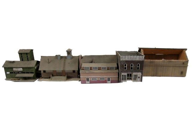 Designed and created by Grant McCune Design Studio is this very unique collection of unidentified collection of miniature buildings including five miniature buildings made of thin wood and plastic. (largest approx. 6 1/2" x 5 1/2"). These may have been featured in a movie, television show or commercial. (largest approx. 9" x 4 1/2")