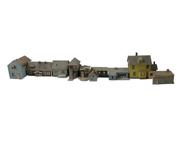 Designed and created by Grant McCune Design Studio is this very unique collection of an unidentified collection of 8 miniature buildings made of thin . These may have been featured in a movie, television show or commercial. Eight miniature buildings made of thin wood and plastic. (largest approx. 5" x 3 1/2")
