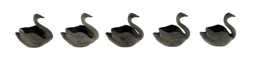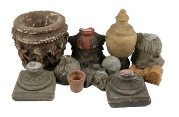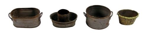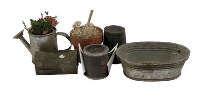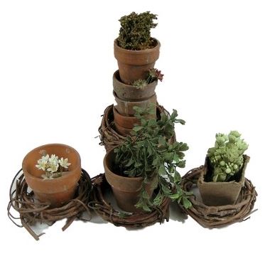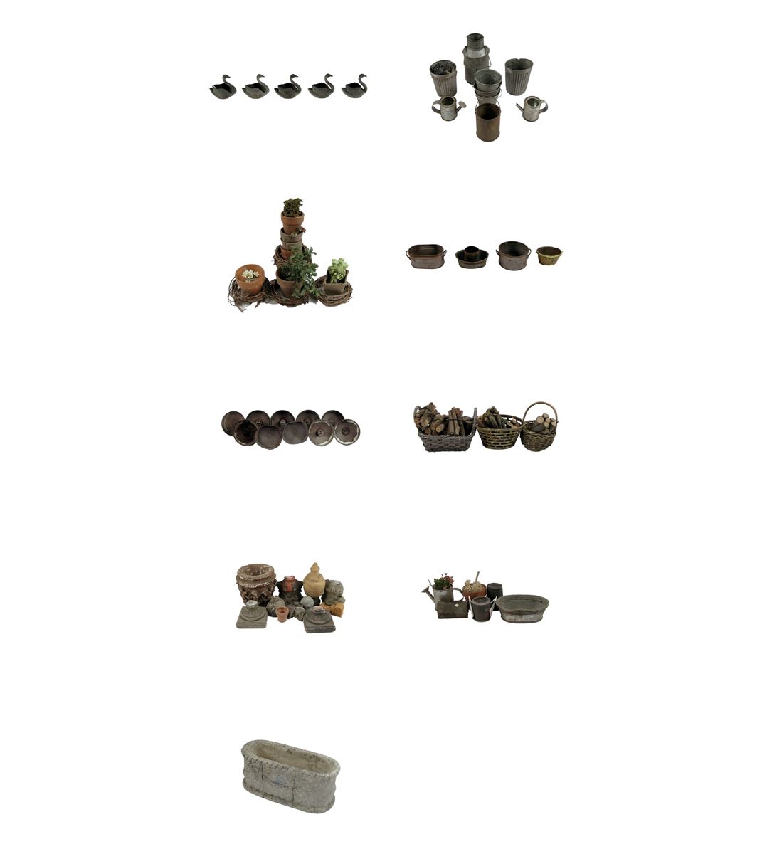 Designed and created by Grant McCune Design Studio is this very unique collection of unidentified miniatures including five miniature swan dishes. (approx. 3" long each), two thin metal miniature trash cans, a studio distressed bucket, three thin metal buckets, thin metal bucket, and two watering pots. (largest approx. 7 1/2" tall) Seven clay pots and one cardboard pot with faux flowers and plants with wood decorative pieces. (largest approx. 3" tall) three miniature metal troughs, one plastic trough, and metal can. (largest approx. 6" long), ten miniature lamps with three light bulbs. (approx. 4 1/2" diameter each), three miniature weaved baskets with miniature bundles of wood. (largest approx. 5" x 2 1/2"), twelve assorted clay decorative pieces. (largest approx. 4" tall), six assorted miniature decorative pieces. (largest approx. 5" long) and clay with design trough. (approx. 8 1/2" x 4")