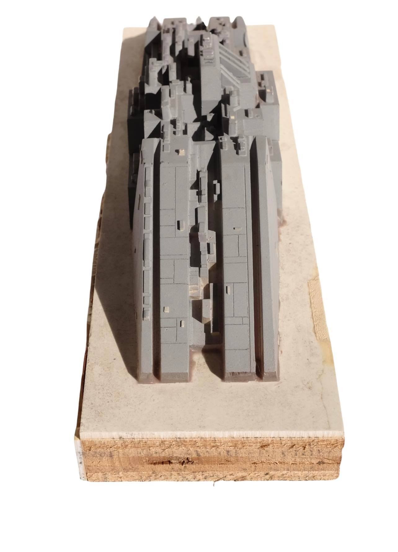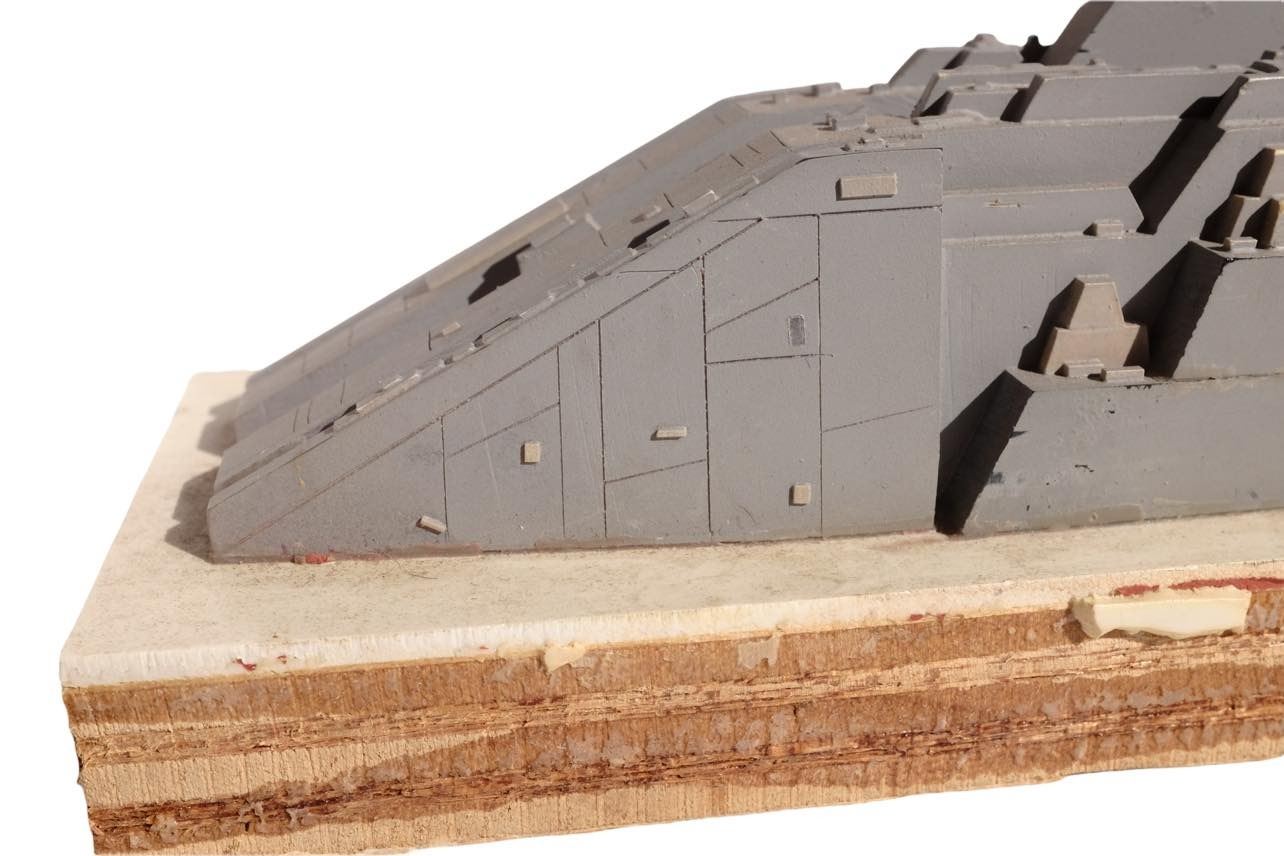 This is the original kit bashed master section of Spaceball One with all the original glued on model pieces. All of the places on Spaceball One where you see this model section were all molded from this original. With original base.