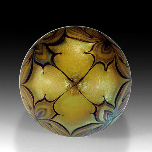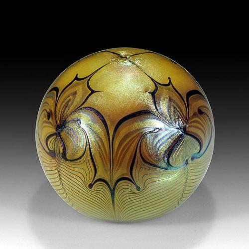 Grant Randolph Studio golden surface-design paperweight. An ornate black, mauve, and gold pulled-feather pattern, decorates a golden-yellow surface. Signed. Diameter 2 3/4".