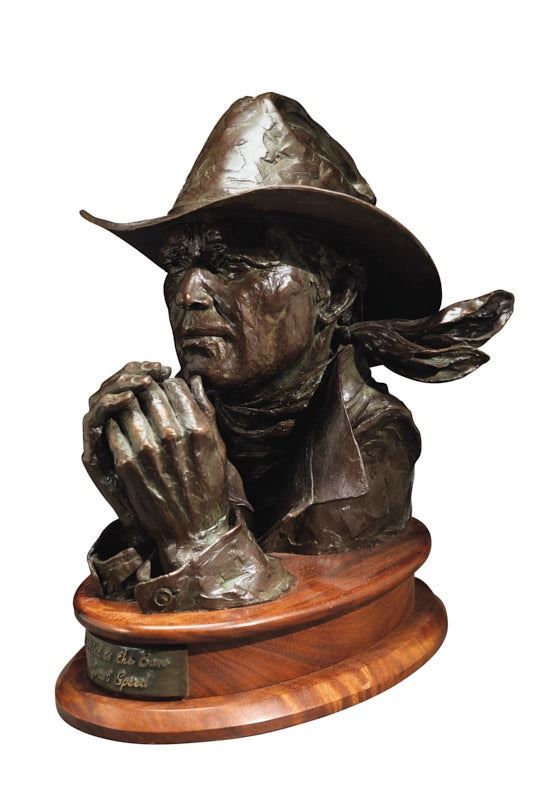 To the unaided eye, this piece appears to be in very good condition. There are no signs of damage or restoration to the bronze. The surface finish is consistent and free of corrosion. The piece is mounted to an ovular wooden base. The base is in good condition, showing normal signs of wear. Plate: Chilled to the Bone, Grant Speed.