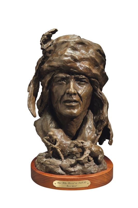 To the unaided eye, this piece appears to be in very good condition. There are no signs of damage or restoration to the bronze. The surface finish is consistent and free of corrosion. The piece is mounted to a wooden base. The base is in good condition, showing normal signs of wear. Plate: One Who Lived to Tell It, Grant Speed.
