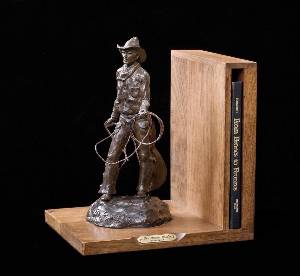The Bronc Rider, 12 1/4” tall not including the bookend base. Bronze. Holds a copy of From Broncs to Bronzes - The Life’s Work of Grant Speed, by Don Hedgpeth.