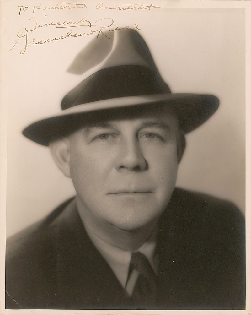 Sportscaster (1880–1954) who would christen a legend when he thus began his report on a 1924 Notre Dame matchup: ‘Outlined against a blue-gray October sky, the Four Horsemen rode again…’ Uncommon vintage matte-finish 8 x 10 photo, signed and inscribed in fountain pen “To Katherine Overstreet, Sincerely, Grantland Rice.” Silvering to darker areas of image, surface impression to facial area, and some light corner creases, otherwise fine condition.