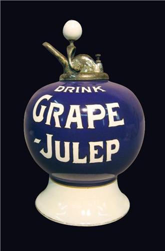 Grape Julep Syrup Dispenser. Says Drink Grape Julep on both sides. Good Original Condition wit some loss to lower gold band. No chips or cracks. Period style ball pump.