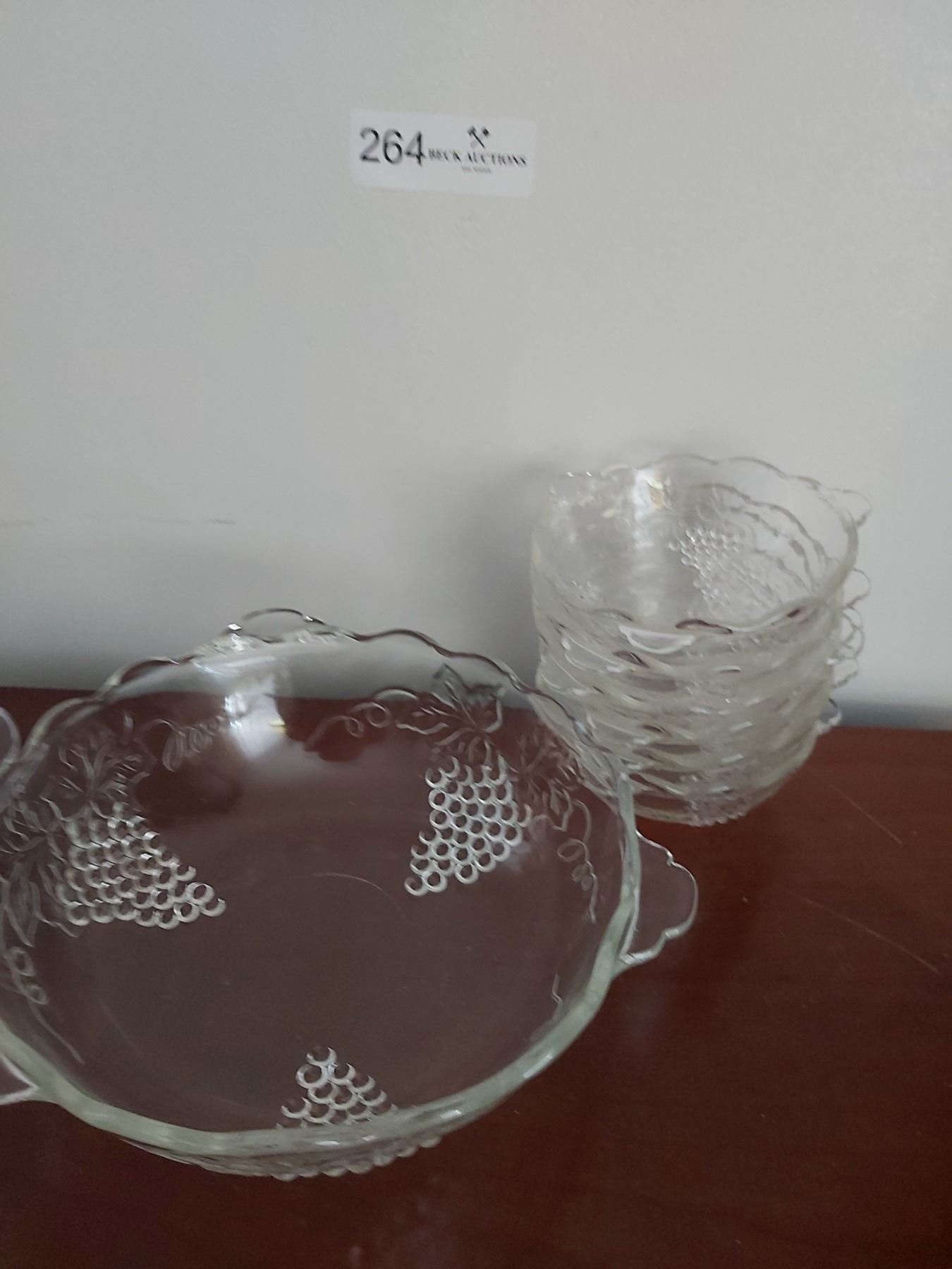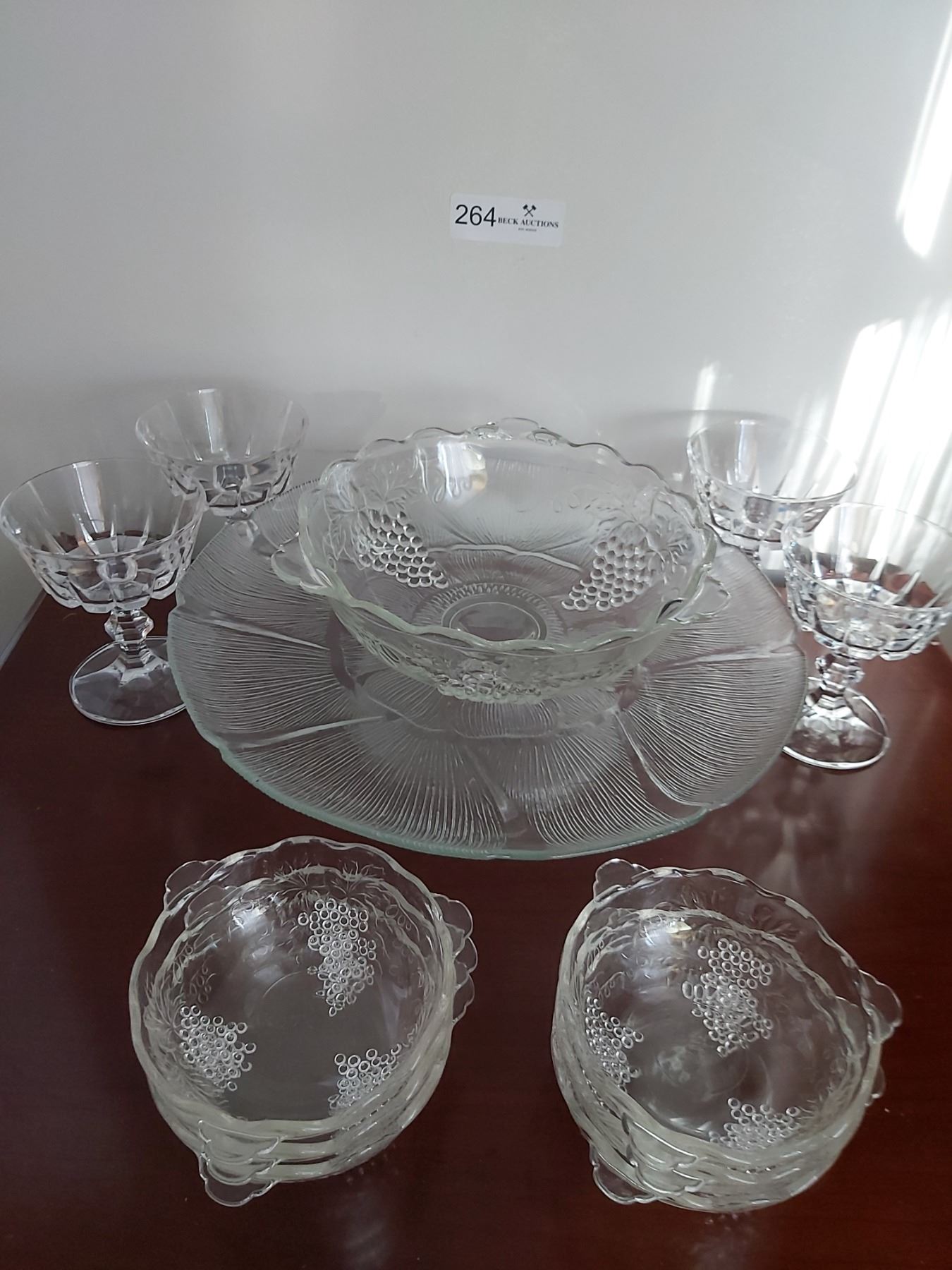 Grape Motif Glass Serving Bowl & Individual Bowls, Cake Stand & 4 Dessert Glasses