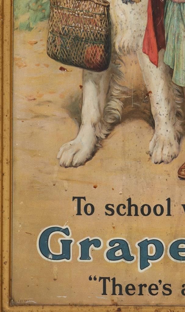 Featured in this lot is this 1910-1920s Grape Nut Cereal self-framed tin sign. In 1897, Charles William "C.W." Post created the cereal known as Grape-Nuts. Post later competed against Dr. John Harvey Kellogg, who had previously treated him as a patient. In order to create tiny kernels that resembled grape seeds, he cooked the cereal as a sheet, split it into pieces, and pulverized it in a coffee grinder. The cereal was sold as a natural food that might boost energy and well-being. Grape Nut Cereal is still being produced to this day. The tin advertisement shows a young girl walking with her St. Bernard dog as she heads off to school holding a small basket and a some flowers. Her dog carries a larger bag and her mother watches them from the front porch. The bottom of the advertisement reads, "To school well fed on Grape-Nuts 'There's a Reason'". The advertisement is constructed of tin and has a wood backboard to keep the advertisement sturdy, strong and to prevent any bending. The piece shows fair condition showing scratches throughout the image and wear from its age. No signs of obvious damage is noted. The piece measures 30 1/4" L x 20 1/4" W x 1 1/8" D. It weighs approximately 8 pounds and 8 ounces.