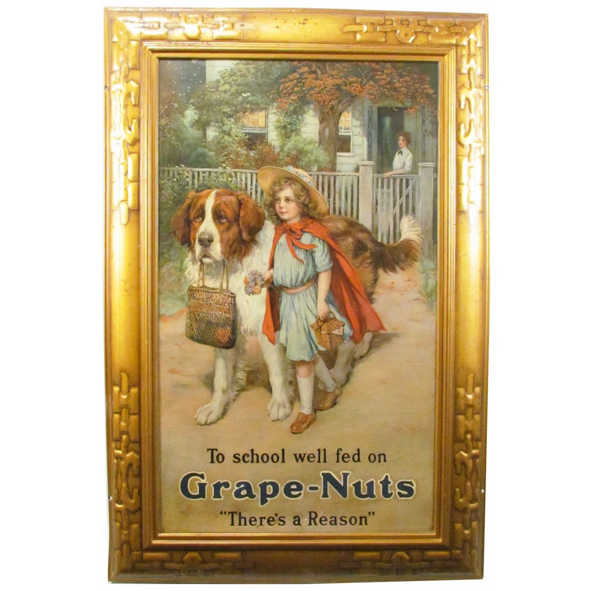Grape-Nuts Self Framed Tin Sign. Image of girl with dog. Excellent condition. 20 X 30 inches.