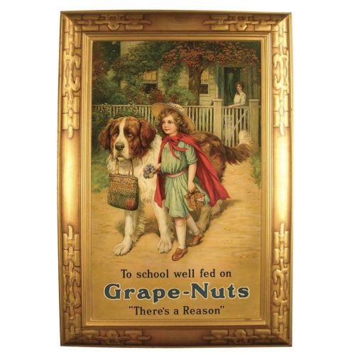 Grape Nuts self framed tin sign. Depicting little girl and St. Bernard. One of the more desirable tin signs ever produced. Near mint condition. 20 X 30 1/2 inches overall.