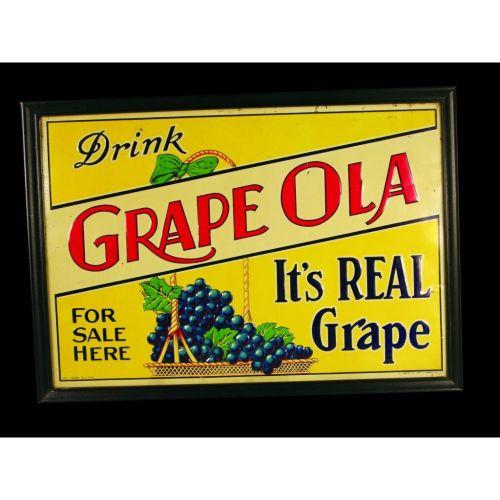 Grape Ola Embossed Tin Sign. W.F. Robertson Steel and Iron Co., Springfield, OH. Minor rust spots, otherwise excellent condition. 19 1/2 x 13 1/2 inches.