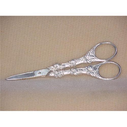 6 1/4" long silver plated grape shears with grape cluster and leaf designed handles. Marked with an axe head and arrow (arrow positioned in place of the axe handle).