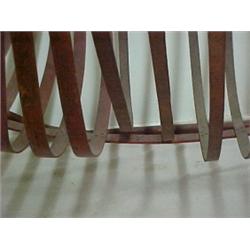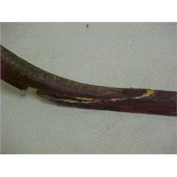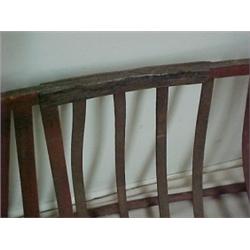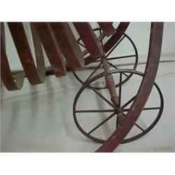 Grape cart, cradle shaped slatted bin, lifts off hooks to empty, on two iron wheels, C shaped handle, original red paint, repair to base, approximately 27" high x 47" across Estimate 80/150