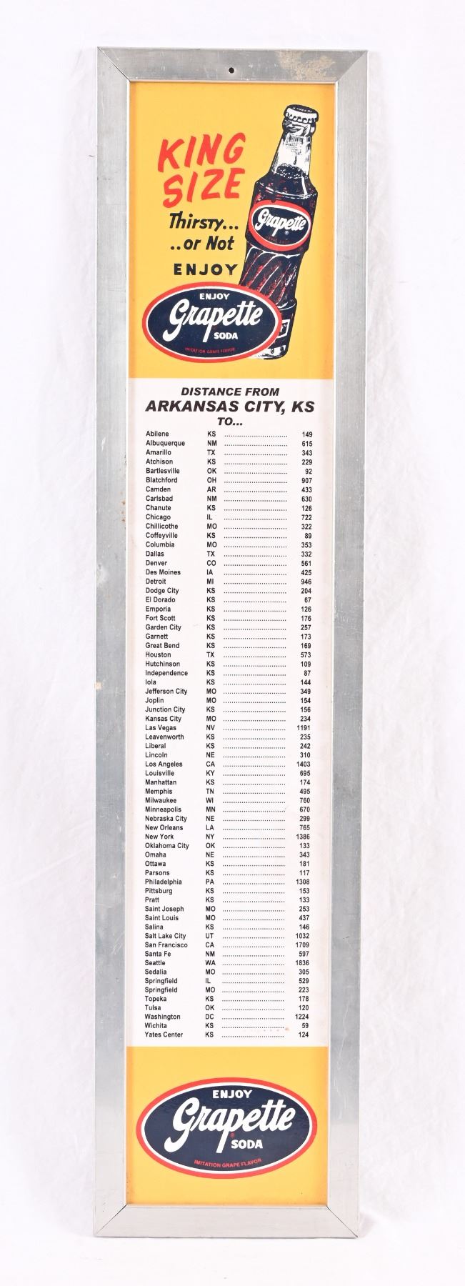 "Distance from Arkansas City, Kansas to...." Grapette advertising, Aluminum framed board sign, 7" x 31"