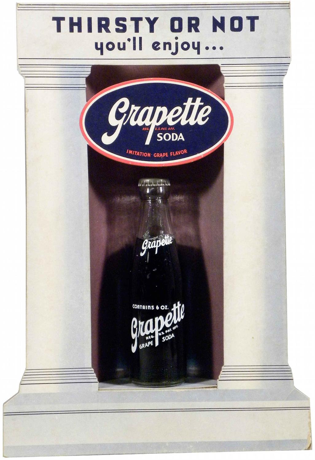 Grapette Soda Cardboard Fold Out Counter Top Bottle Display. Comes with 6 oz. bottle. Very slight discoloration and dog eared lower right corner otherwise excellent condition. 10 1/2 X15 1/4 inches.