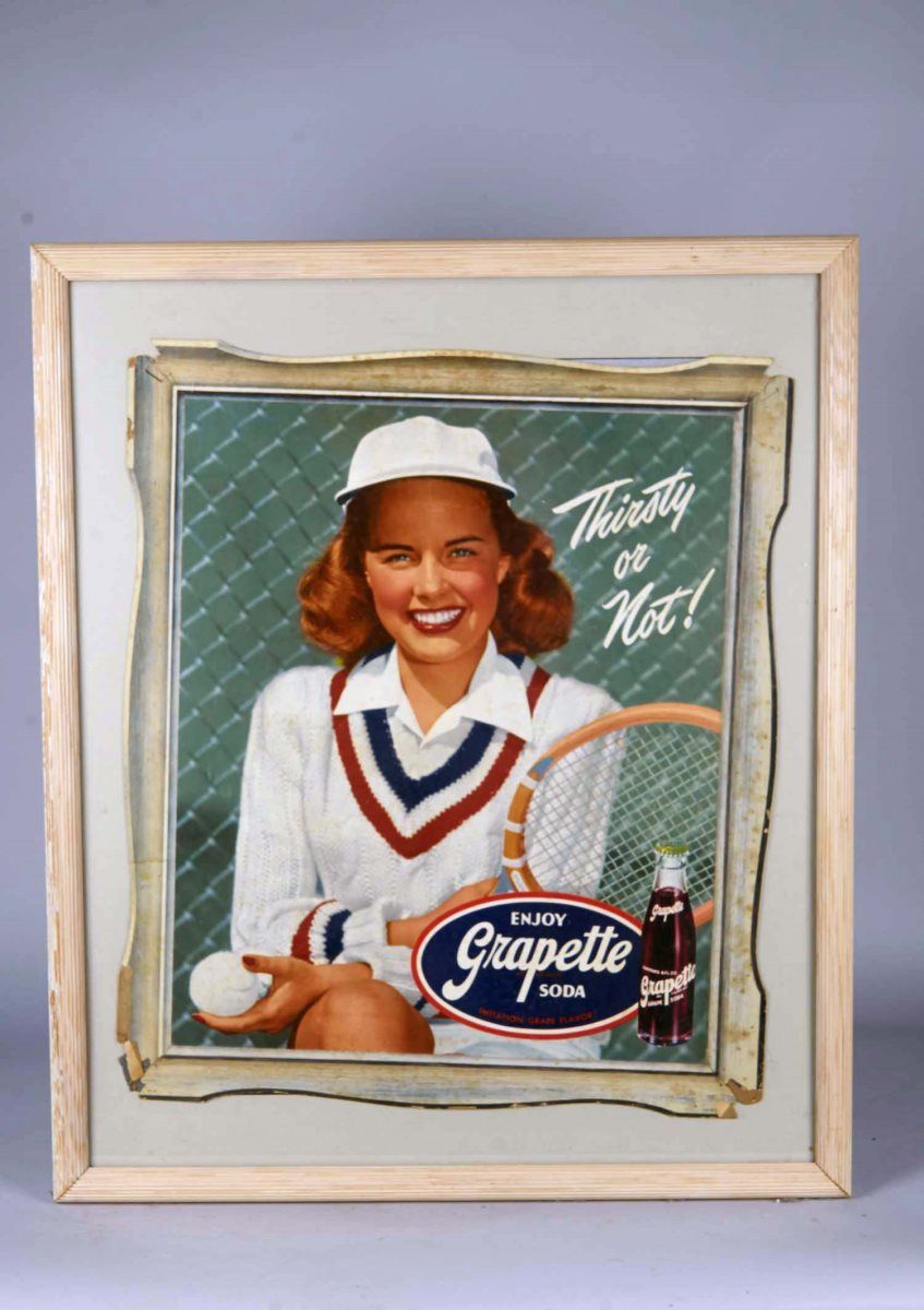 Cardboard advertisement is mounted under glass circa 1950s, reads "Thirsty Or Not! Enjoy Grapette Soda" featuring young woman at the tennis court. Condition (Very good). Size 30" x 35-5/8"