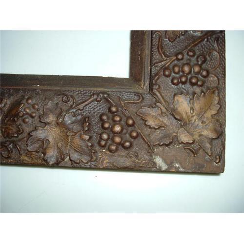 The design of the old frame is beautiful! Along the way I beleive someone put a dark stain over goldleaf. The measurements are: 19-1/4 by 19-1/4", on the outside and 11-1/2 by 11-1/2" on the inside. There is one spot that is missing the raised design as shown in the picture.