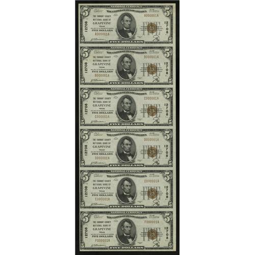 <B>Grapevine, TX</B></I> - $5 1929 Ty. 1 <B>The Tarrant County NB</B></I> Ch. # 12708 Uncut Sheet<BR>This all serial number 1 sheet comes from a tougher small size only Metroplex bank that has had only five appearances in the last dozen years. In fact, this sheet is from the Irish Collection sale of August 1997. A small spot is noticed above Lincoln's head on the B position note. <B>Choice Crisp Uncirculated.</B></I><BR><BR><b>Shipping:</b> Coin/Currency (<a target="_blank" href="http://www.heritageauctions.com/common/shipping.php">view shipping information</a>)