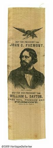 <B>Graphic John C. Fremont Silk Ribbon</B></I> This 2" x 7" pink silk taffeta ribbon shows the first Republican presidential candidate, John Charles Fremont. We believe it originated in Philadelphia. It shows the Pathfinder of the West, an eagle and is inscribed "For President John C. Fremont. For Vice-President William L. Dayton. Free Soil, Freedom and Fremont." Condition is outstanding. Unusual Fremont ribbons are hard to come by, especially with such great slogans! Lot:256