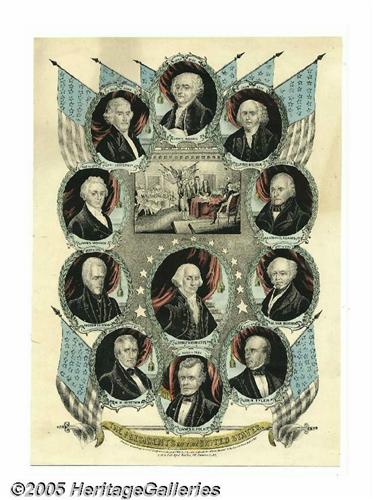<B>Graphic and Colorful James K. Polk Inaugural Print</B></I> 10" x 14" hand-colored small folio lithograph published by J. Baillie in New York, circa 1845, titled "The Presidents of the United States." All the presidents through Polk are depicted with their years in office, along with Trumbull's rendition of the signing of the Declaration of Independence. Colors are vibrant, including deep rose, powder blue and yellow. The condition is superb, clean and bright! Lot:256