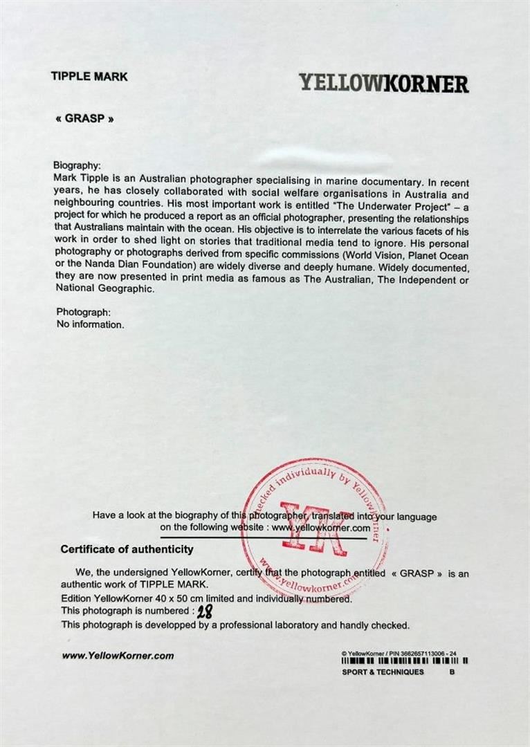 Grasp, Tipple Mark Australia Underwater Surfer YellowKorner Certified Photograph. Certificate of Authenticity from YellowKorner affixed to the back. Matted Dimensions 16"x20". Protected with Clear Mylar Sleeve.