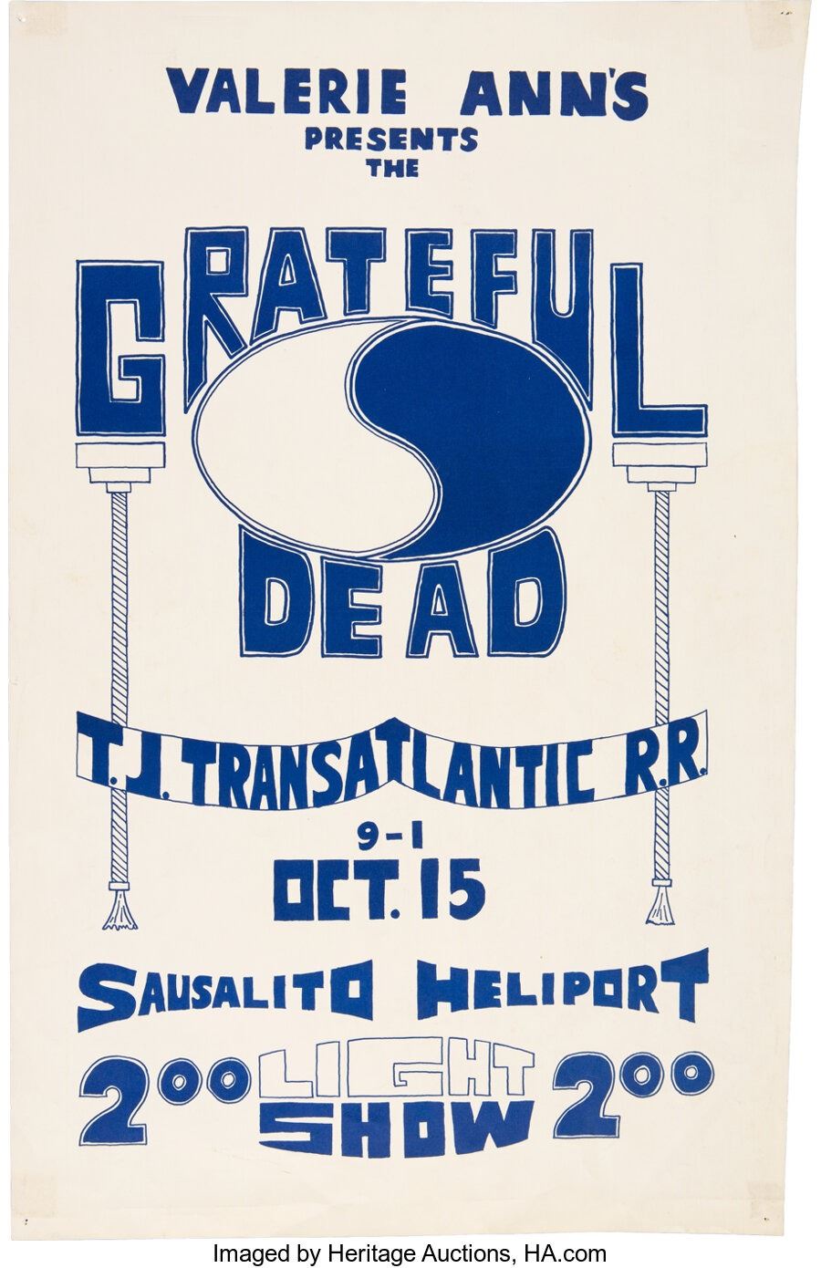 Grateful Dead 1966 Sausalito, CA Heliport Concert Poster In Their Rehearsal Space.An original blue-ink-on-white-paper concert poster for the Grateful Dead appearing at one of their favorite rehearsal spaces, the Sausalito Heliport, in the Bay-Area suburb of Sausalito, California on Saturday night, October 15, 1966. Transatlantic Railroad was the opening band. As for the promoter, Valerie Ann's? That was a hip clothing store in nearby Larkspur in Marin County.