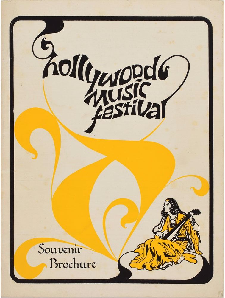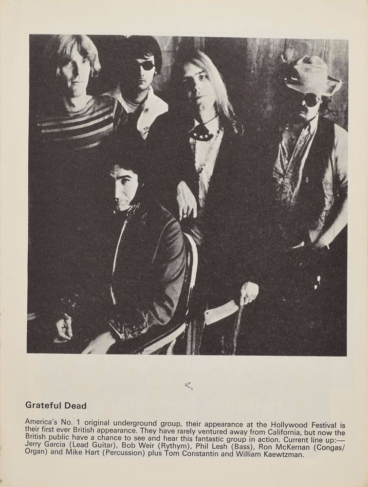 Uncommon souvenir brochure for the inaugural Hollywood Music Festival held near Newcastle-under-Lyme, Staffordshire, England, on May 23 and 24, 1970, sixteen pages, 7.75 x 10. The brochure features images of several of the artists and groups scheduled to perform, including: Grateful Dead, Free, Ginger Baker's Air Force, Colosseum, Family, Black Sabbath, Traffic, Mungo Jerry, and Jose Feliciano. The Hollywood Music Festival was notable for the first performance of Grateful Dead in the UK. In fine condition, with some light staining to the cover.