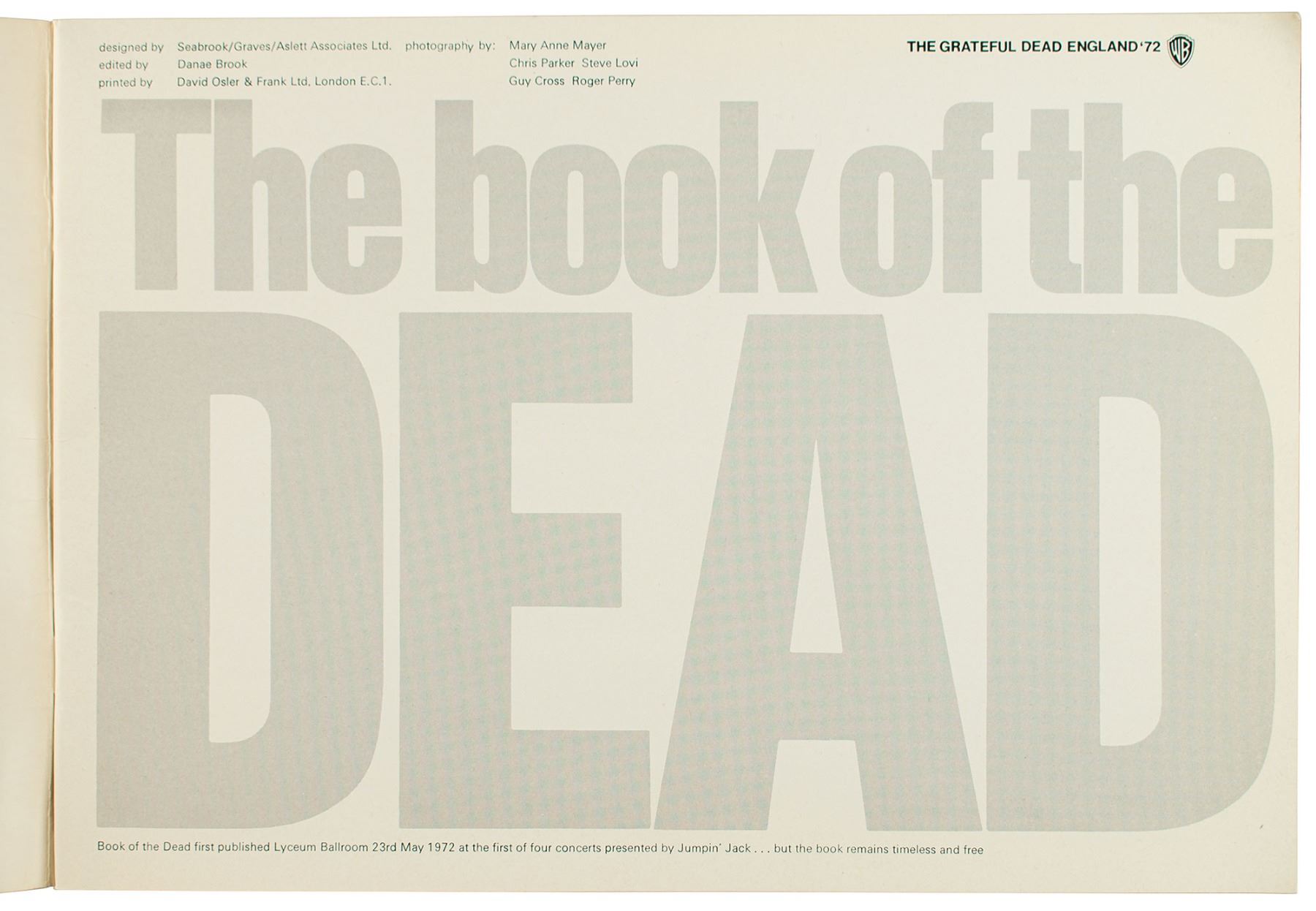 Uncommon unsigned "Book of the Dead" program for the Grateful Dead's 1972 tour of England, 11.75 x 8.25, 32 pages, featuring images and biographies of the band members inside, as well as a narrative about the tour. In fine condition.
