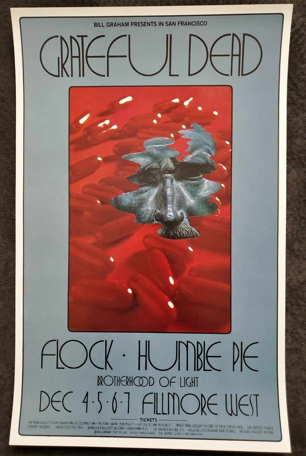 This is a second print, post-concert poster (printed post concert) from a December 1969 performance by the Grateful Dead, Humble Pie and the Flock, at the Fillmore West, San Francisco, California.