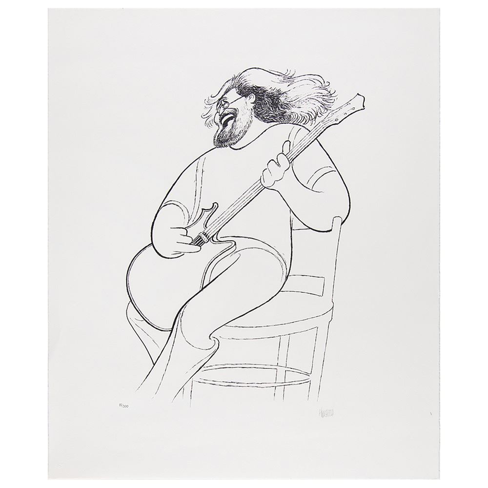 Limited edition 20 x 24 lithograph of an Al Hirschfeld work from 1995 entitled 'Jerry Garcia,' depicting the Grateful Dead frontman seated and playing the guitar, numbered 82/300, signed below in pencil by the artist. Rolled and in very fine condition. This drawing is featured on page 335 in Hirschfeld's bestselling book 'On Line.'