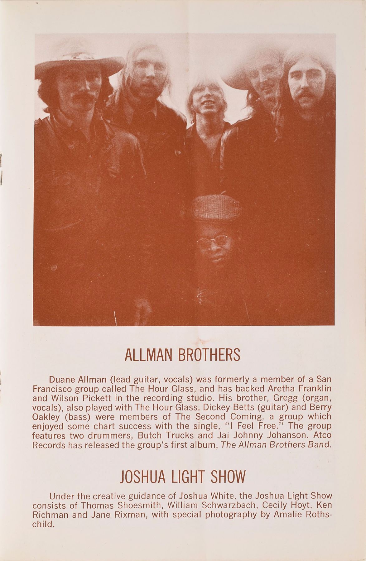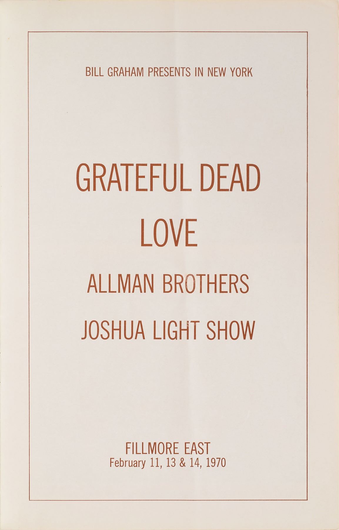 Scarce Fillmore East concert program, 5.5 x 8.5, 24 pages, for the Grateful Dead, Love, and Allman Brothers concerts on February 11, 13, and 14, 1970. The program features short biographies of the bands and is like a time capsule of the 1960s, filled with numerous period advertisements. In fine condition, with a central vertical fold. At February 11th's late show, the Grateful Dead were joined onstage by Duane and Gregg Allman, Berry Oakley, and Butch Trucks of the Allman Brothers Band, and Peter Green and Mick Fleetwood of Fleetwood Mac for an infamous jam.