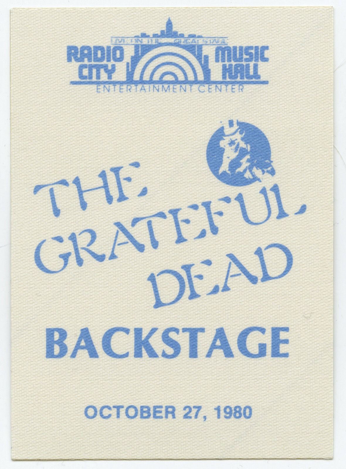 This is an authentic original UNUSED (backing is still affixed to pass) satin backstage pass for THE GRATEFUL DEAD appearing October 27, 1980 at the world famous Radio City Music Hall in New York City. The pass measures approximately 2 1/2" x 3 1/2"