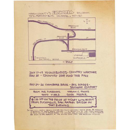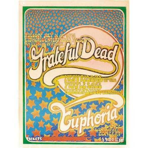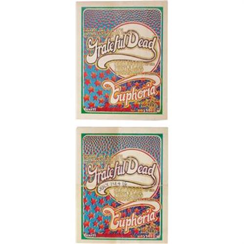 <B>Grateful Dead Euphoria Concert Poster and Postcard Group (1970).</B></I> The stars all come out to play on this poster and postcard set, from San Rafael's Euphoria Ballroom. Speaking of stars, it's long been rumored that David Crosby sat in with the band for two songs during one set! Opening the show for the Dead was New Riders of the Purple Sage. The poster, believed to have only been printed once, has tackholes in all four corners, with a small stain in the lower border area and some slight discoloration and light stains throughout. It's still a very attractive VG piece, measuring 13.75" x 18". The two postcards both show more wear and were folded at one time; one is marked "July 14 & 16" on the front in felt tip, and stamped "Complementary" on the back (which includes a printed map). This card grades at GD, while the other (with no markings added) rates a GD/VG.<BR><BR><b>Shipping:</b> Flat Material, Large (<a target="_blank" href="http://www.heritageauctions.com/common/shipping.php">view shipping information</a>)