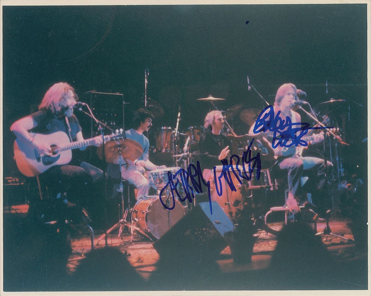Excellent color glossy 10 x 8 photo of the Grateful Dead during a live performance, signed in blue felt tip by Jerry Garcia and Bob Weir. In fine condition, with a tack hole to right edge.