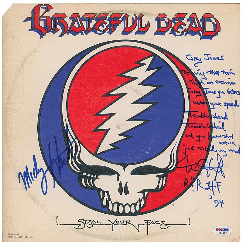 Steal Your Face album signed on the front cover in blue felt tip by Mickey Hart and Tom Constanten, adding the opening verse of lyrics to ‘Casey Jones.’ Mild ‘ring of wear’ to front cover, some light soiling, and a PSA/DNA authentication label affixed to front cover, otherwise fine condition. The record is included.