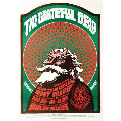 <B>Grateful Dead "Hippie Santa Claus" Avalon Ballroom Concert Poster, FD-40 (Family Dog, 1966).</B></I> Here's a great, single-printing Dead poster, featuring a rather evil-looking Kris Kringle, for the band's 1966 Christmas Eve shows at the Avalon, featuring Steve Miller and Moby Grape. In fact, artist Victor Moscoso, of <B>Zap Comix</B></I> fame, referred to him as the "Satanic Santa", based on the European tradition of a "bad Santa" who visits naughty boys & girls each December 25th. "Ho ho ho" indeed! You'll be all smiles if your bid snags this NM copy, though. Approximate size is 14 3/8" x 19 15/16".<BR><BR><b>Shipping:</b> Other (oversized items, group lo (<a target="_blank" href="http://www.heritageauctions.com/common/shipping.php">view shipping information</a>)