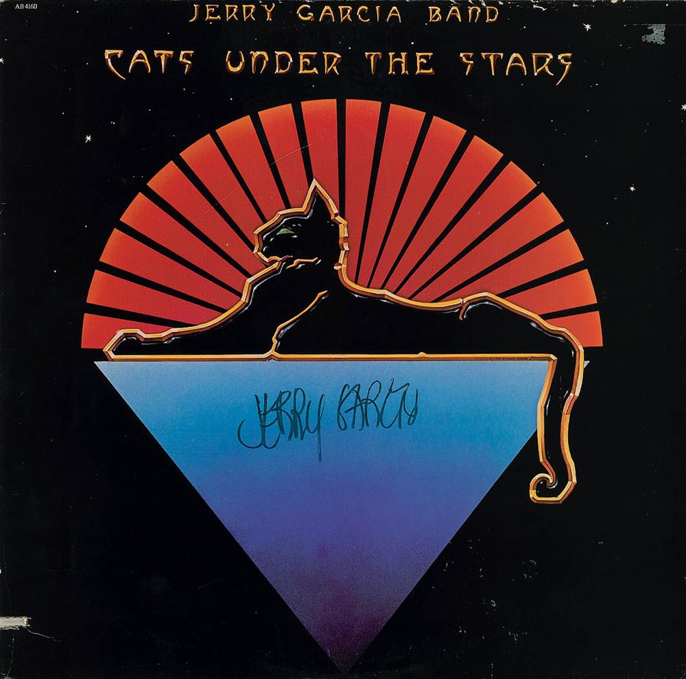Jerry Garcia Band’s Cats Under the Stars album signed on the front cover in black felt tip. In fine condition, with a mild album impression, discount cut to lower left, and a few scattered surface creases. The record is included.