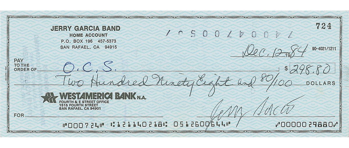 Rare Jerry Garcia Band Home Account check, 8.25 x 3, filled out in another hand and signed by Garcia, payable to O. C. S. for $298.80, December 12, 1984. In fine condition, with expected stamps to both sides. The Jerry Garcia Band was formed by the Grateful Dead founder in 1975 as a side-project and featured a rotating collection of musicians who toured and occasionally recorded, usually during the Dead’s downtime. At the time of writing this check, Garcia and his band had just concluded a two-week swing through northern California and the Northwest, finishing at the Keystone in Palo Alto on December 10. An extremely uncommon offering, with this being the first Garcia Band check we have offered.