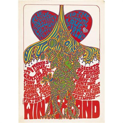 <B>Grateful Dead "Love Circus" Winterland Concert Poster (1967).</B></I> Here's a very unusual and extremely colorful concert poster promoting the "First Annual Love Circus" by a collective calling themselves the "Love Conspiracy Commune". Headlining the show was the Grateful Dead, with able support from Moby Grape and Loading Zone, but the real star here is the amazing psychedelic artwork, provided by an artist known simply as Herrick. The poster measures approximately 17.5" x 25", and is in VG+ condition.<BR><BR><b>Shipping:</b> Flat Material, Large (<a target="_blank" href="http://www.heritageauctions.com/common/shipping.php">view shipping information</a>)