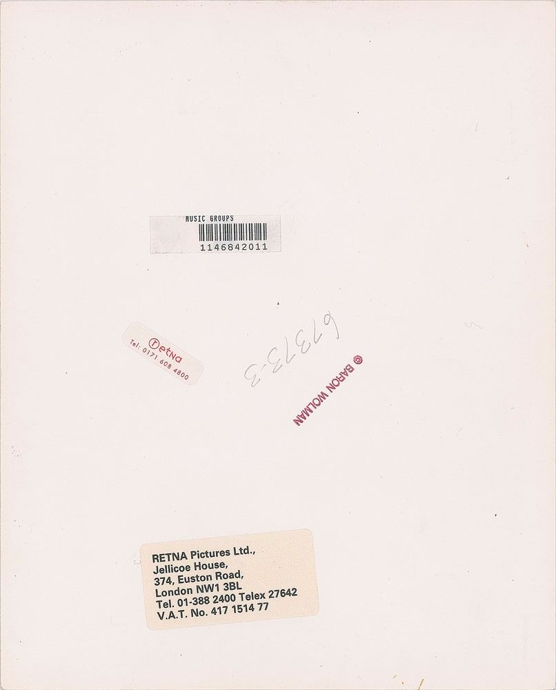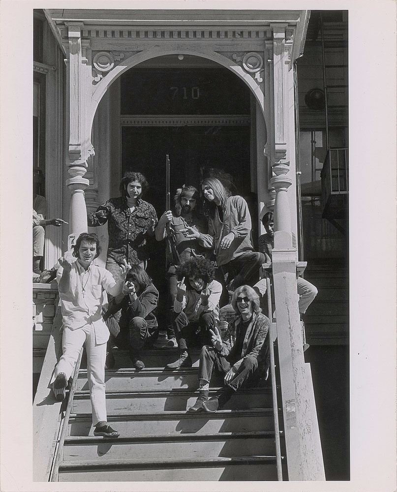 Original matte-finish 8 x 10 silver gelatin photo of the Grateful Dead outside their home at 710 Ashbury Street in San Francisco in October 1967, printed from the original negative circa 1970s–80s. Reverse bears a Baron Wolman copyright stamp and two affixed RETNA Pictures labels. In fine condition. Wolman is a famed rock photographer best known for his work with Rolling Stone during the magazine's nascent years. From the Globe Photo archives.