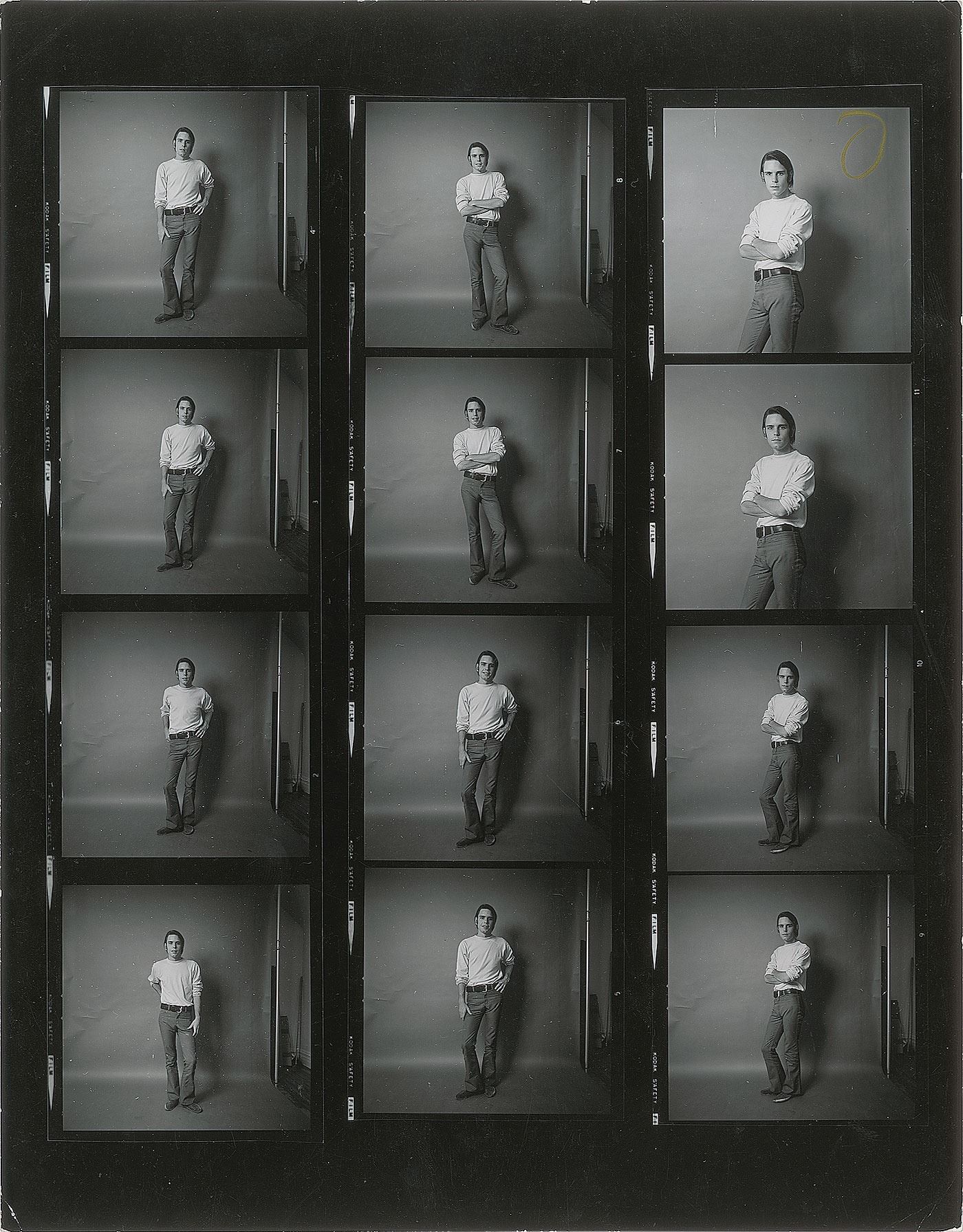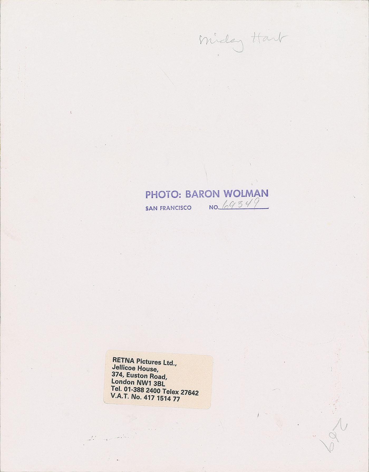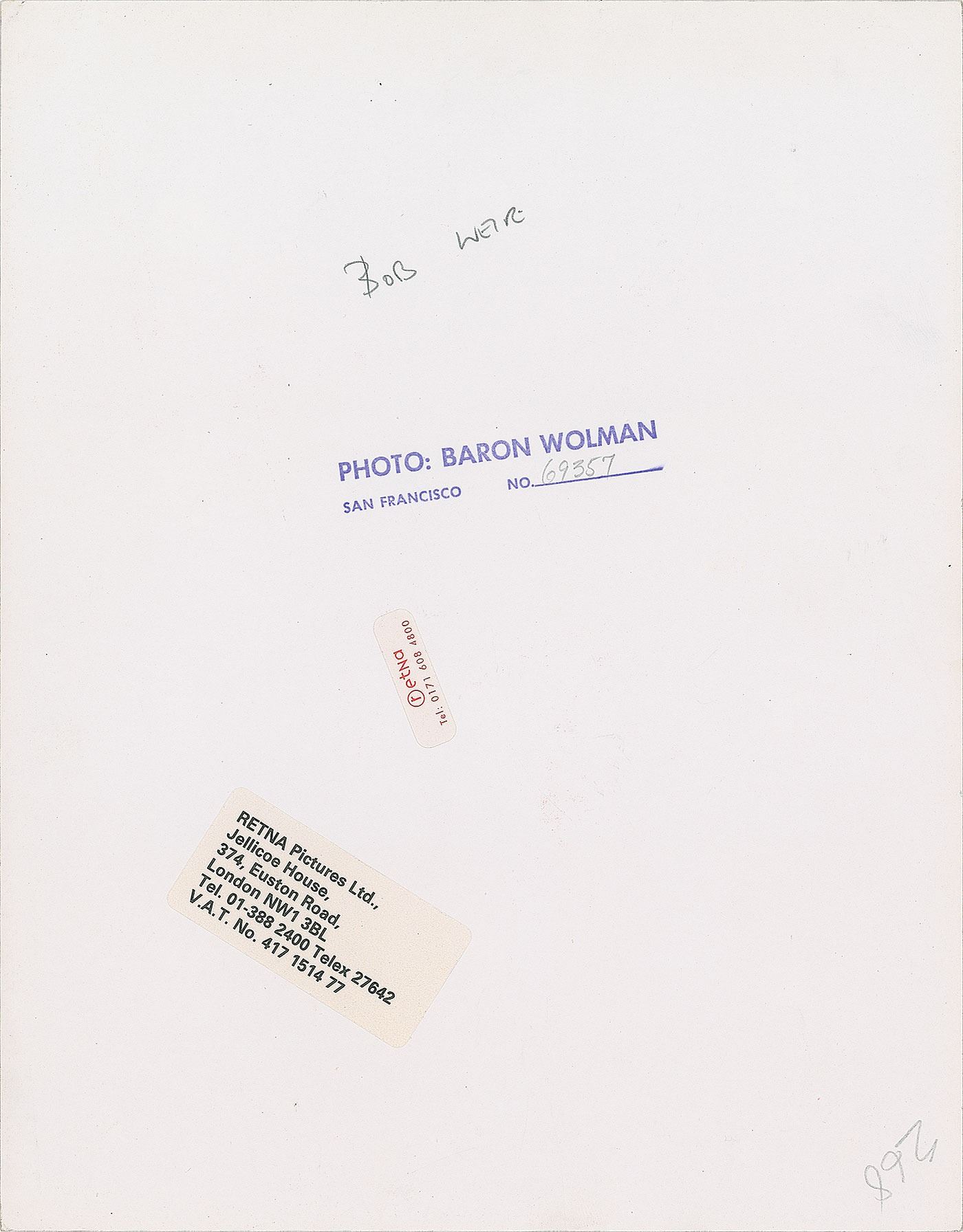 Two original vintage glossy 8.5 x 11 contact sheet prints featuring Grateful Dead band members: one with twelve images of singer-songwriter and guitarist Bob Weir, one portrait marked in grease pencil; and one with twelve images of drummer Mickey Hart, two portraits marked in grease pencil. Both bear Baron Wolman credit stamps and RETNA Pictures labels on the reverse. In overall fine condition, with light edgewear and slight creasing to corners. Wolman is a famed rock photographer best known for his work with Rolling Stone during the magazine's nascent years. From the Globe Photo archives.