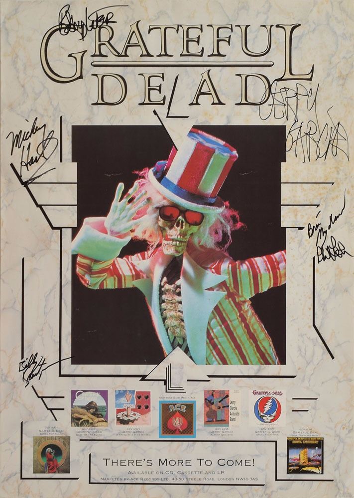 Uncommon Ace Records promotional color 17 x 24 poster for various Grateful Dead and Jerry Garcia releases, signed in black felt tip by Garcia, Bob Weir, Mickey Hart, Bill Kreutzmann, and Phil Lesh, who adds an inscription. The poster prominently shows the Uncle Sam skeleton, and displays a set of seven releases below, including: the Grateful Dead's Blues for Allah, Wake of the Flood, Steal Your Face, and From the Mars Hotel, Jerry Garcia's The Wheel and Almost Acoustic, and Bob Weir's Ace. In fine condition, with trivial scattered creases, primarily to borders.