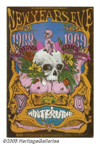 <B>Grateful Dead/ Quicksilver Messenger Service Winterland Poster #BG152 12/31/68 (Bill Graham, 1968).</B></I> It's a New Year's Eve frolic at the Winterland featuring "the Quick and the Dead" for an all-night show including It's A Beautiful Day, Santana, and breakfast! What better place to be! Really wild Lee Conklin art shows an infant popping out of a skull. Scarce 14" x 21" poster is flat but does show some light wear along the edges. VG.