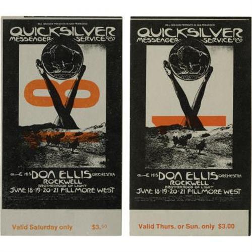 <B>Grateful Dead/Quicksilver Messenger Service Ticket and Postcard Group (Bill Graham, 1966-70).</B></I> Included in this group are two postcards: BG-32 Grateful Dead, 10/21/66, and Grateful Dead/Quicksilver Messenger Service "New Years Eve" BG-152 12/31/68; plus two tickets for Quicksilver's 6/18/70 Fillmore West show, BG-239 (one for Thursday or Sunday, one for Saturday); a Quicksilver BG-242 ticket for Thursday/Sunday; and a New Years Eve Grateful Dead Winterland ticket, BG-263 12/31/70. All items average in VG+ condition.<BR><BR><b>Shipping:</b> Flat Material, Small (<a target="_blank" href="http://www.heritageauctions.com/common/shipping.php">view shipping information</a>)
